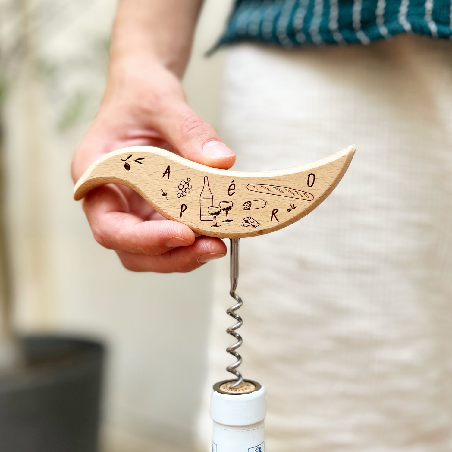 En Juin 2023, vint la suite logique des indispensables de l’Apéro: le tire-bouchon. Mais pas n’importe lequel; toujours à la recherche d’originalité et d’objets de fabrication toujours plus responsable et Française, nous choisissons un tire-bouchon 100% français, de fabrication artisanale et unique. Modèle déposé, créativité grandissante, nous décidons d’y graver nos propres designs et proposer la personnalisation (évidemment).
