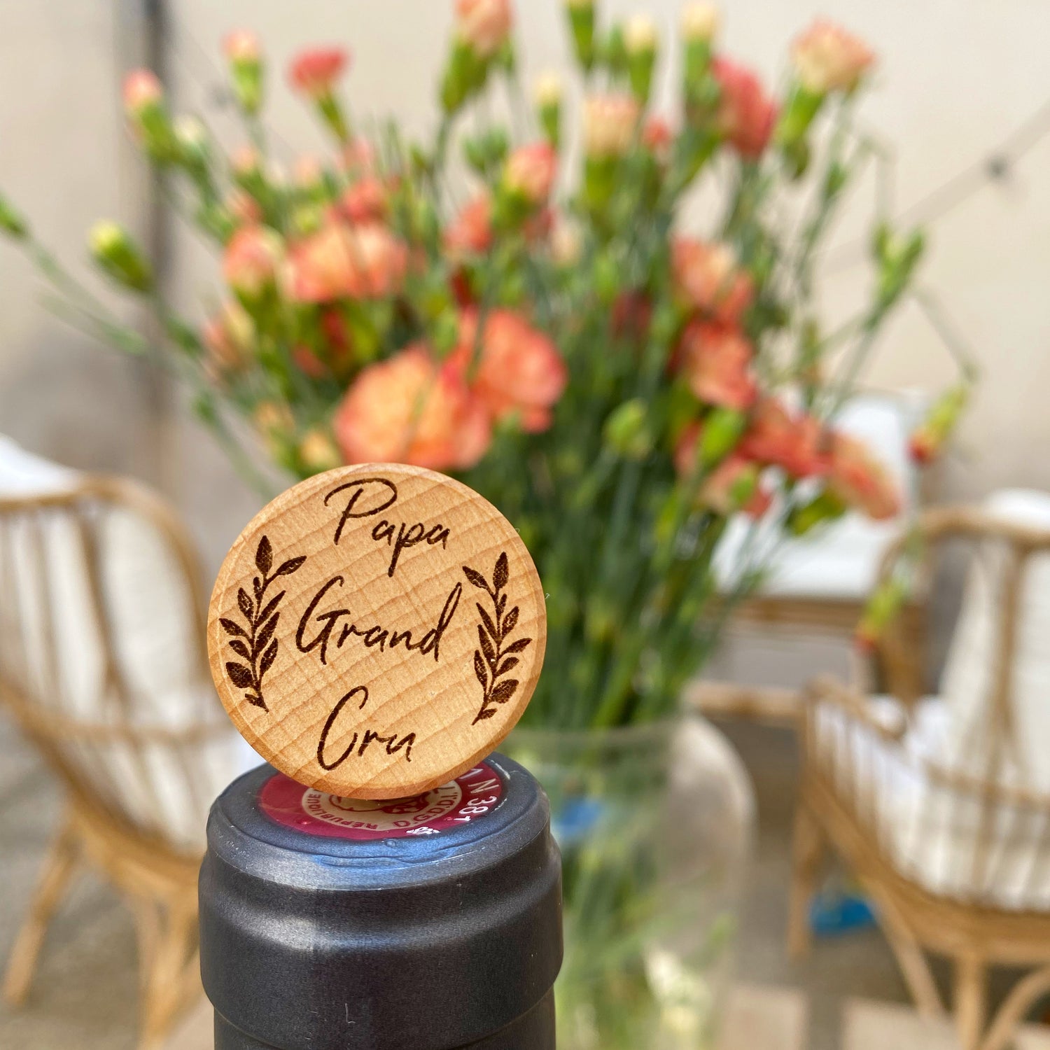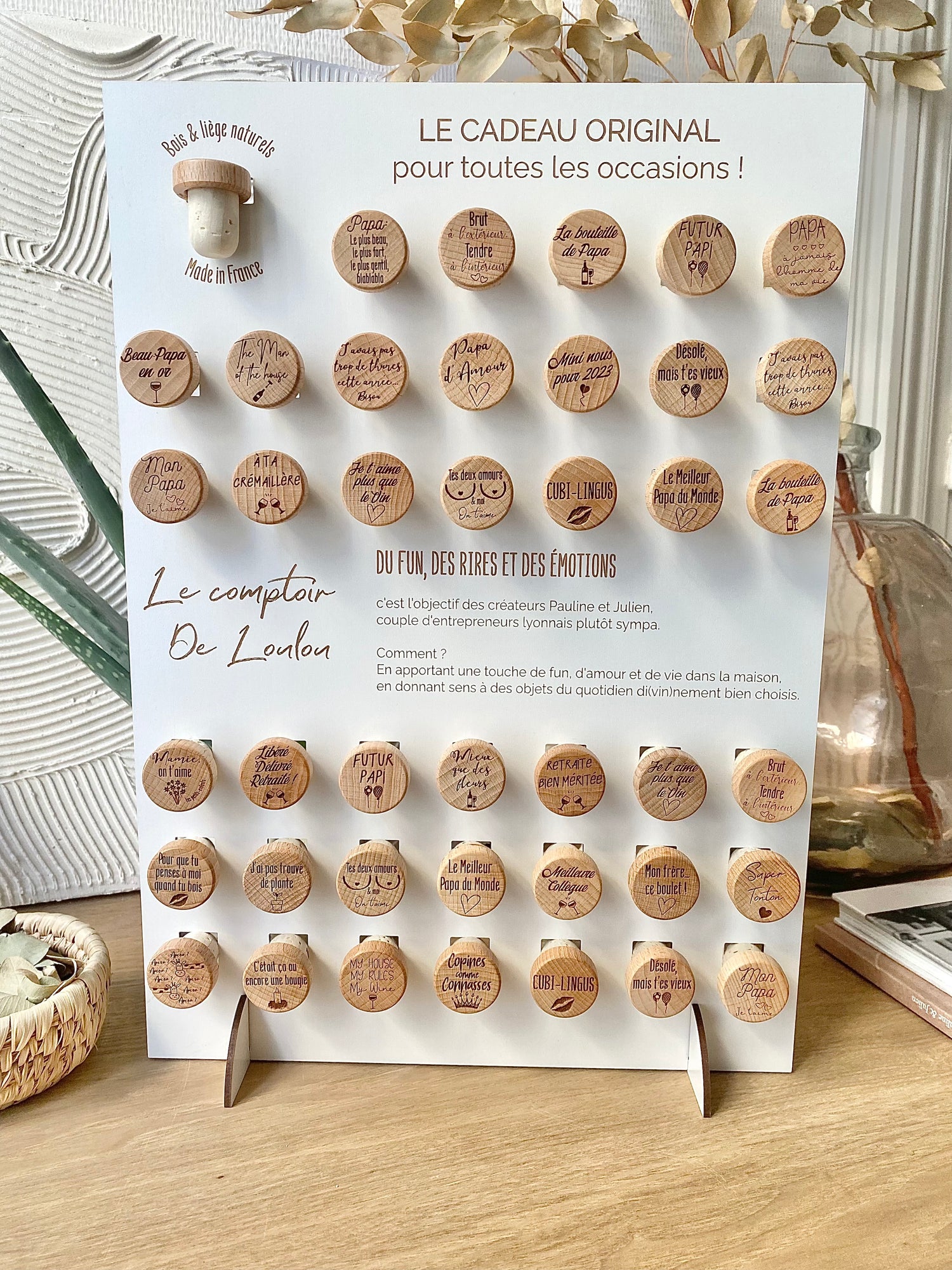Les bouchons de vin personnalisés sont alors nés. Un petit cadeau en bois et liège naturels, personnalisable pour toute occasion, pour toute la famille.